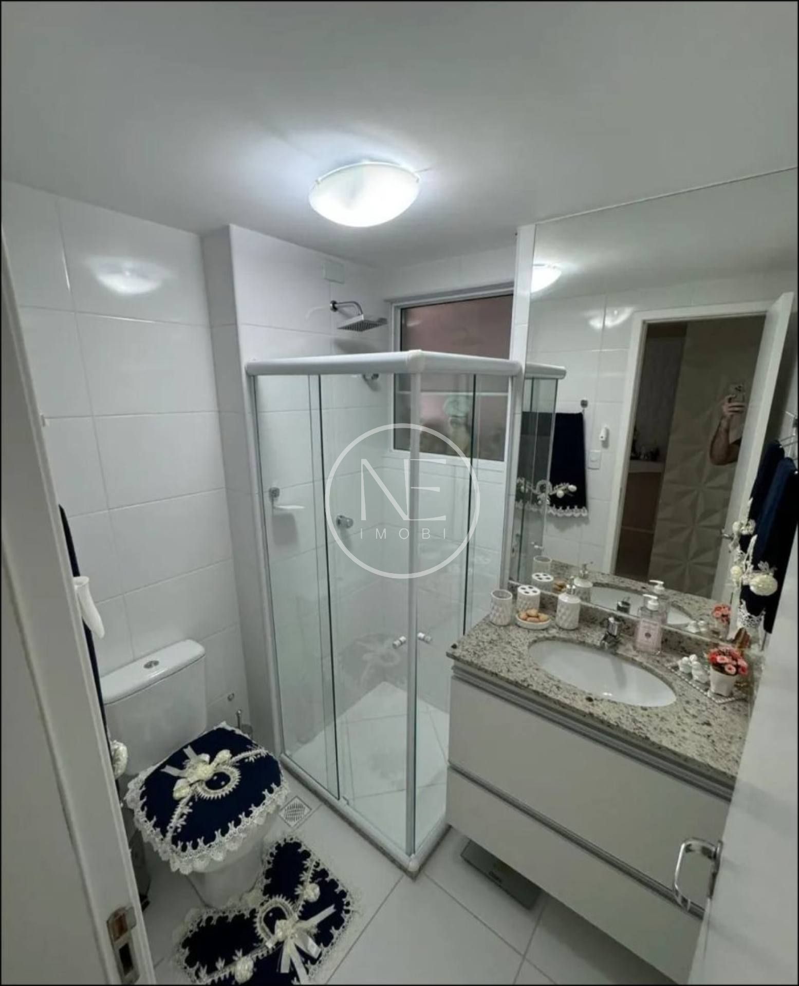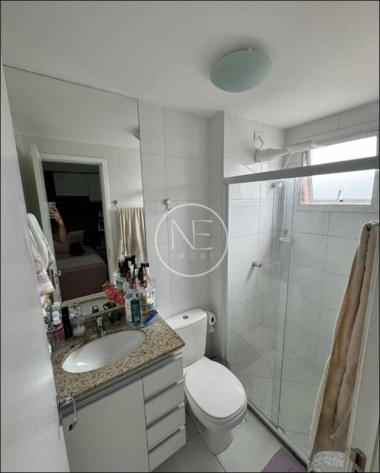 Banheiro social e suíte com box, armário e espelho